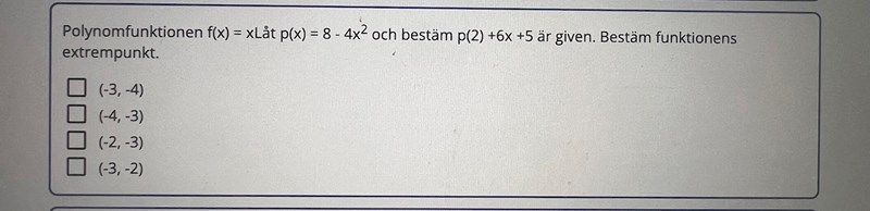 Polynomfunktionen f(x) = xLåt p(x) = 8 - 4x^2 och bestäm p(2) +6x +5 är given. Bestäm funktionens extrempunkt.