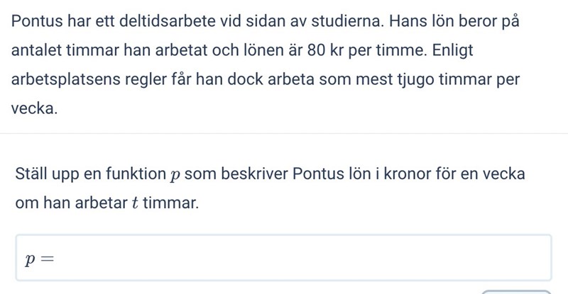 jag tänker att svaret har något med 80t. men jag vet inte hur jag ska få in att han max får jobba 20 timmar.