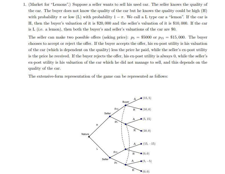 Jag ska hitta alla "pooling pure strategy equilibrium" till spelet nedan. Sannolikheten att Seller är typ H är givet, pi, och typ L, (1-pi). Vidare, om Seller spelar pooling strategy (P_5, P_5), föredrar Buyer strategy A framför strategy enbart om pi>=1/4.