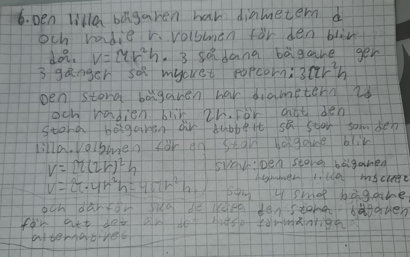 3-vid en fotbollsmatch ska Frida och hennes kompis köpa popcorn i bägare. Bägarna har formen av en kon. de har samma höjd, metn den stora har dubbelt så stor diameter som den lilla. den sotra kostar 30kr och den lilla kostar 10kr. ska de köpa en stor eller tre små bägare för att få så mycket popcorn som möjligt för sina 30kr? motivera ditt svar!