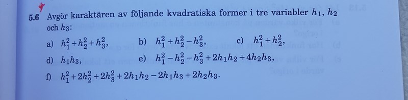 Fråga f) Jag trodde denna var positivt definit eftersom efter kvadratkomplettering blev allt positivt, men den är indefinit. Jag tänker själv att det beror på att det är för många "kvadreringar" 4st och det bara får vara 3 när det är 3 variabler. Tänker jag rätt? Kan någon förklara?