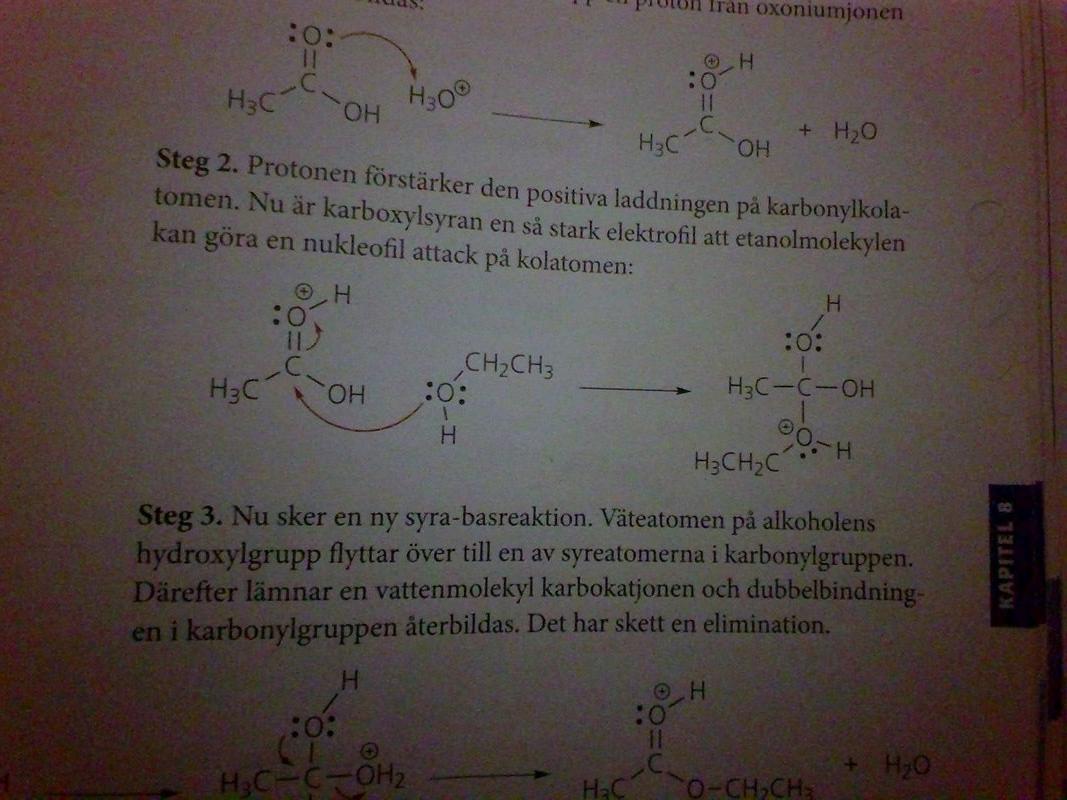 Jag förstår inte hur syret på karbonylgruppen i den övre rektionen och syret på alkoholen i den undre reaktionen blir positiv laddad?! De binder ju sig med de fria elktronerna som syret redan har, hur får den ett underskott på elektroner och en positiv laddning?