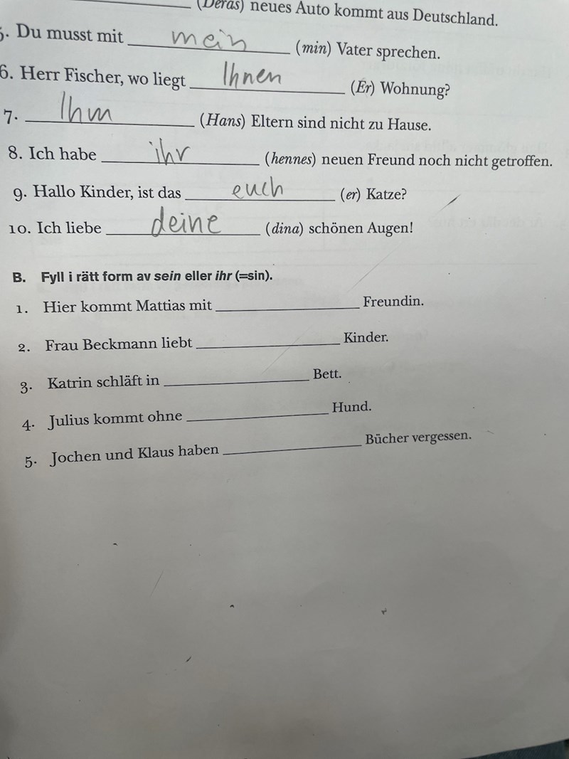 6, 9. Ihnen kan översättas med "Er" ibland, och euch med "er", så om man bara slår upp ordet och tar fel alternativ kan det bli så. Men titta hellre i en tabell med possessiva pronomen, rubriken säger ju det.