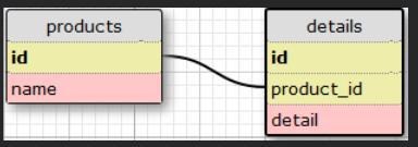 "For this challenge you need to PIVOT data. You have two tables, products and details. Your task is to pivot the rows in products to produce a table of products which have rows of their detail. Group and Order by the name of the Product.