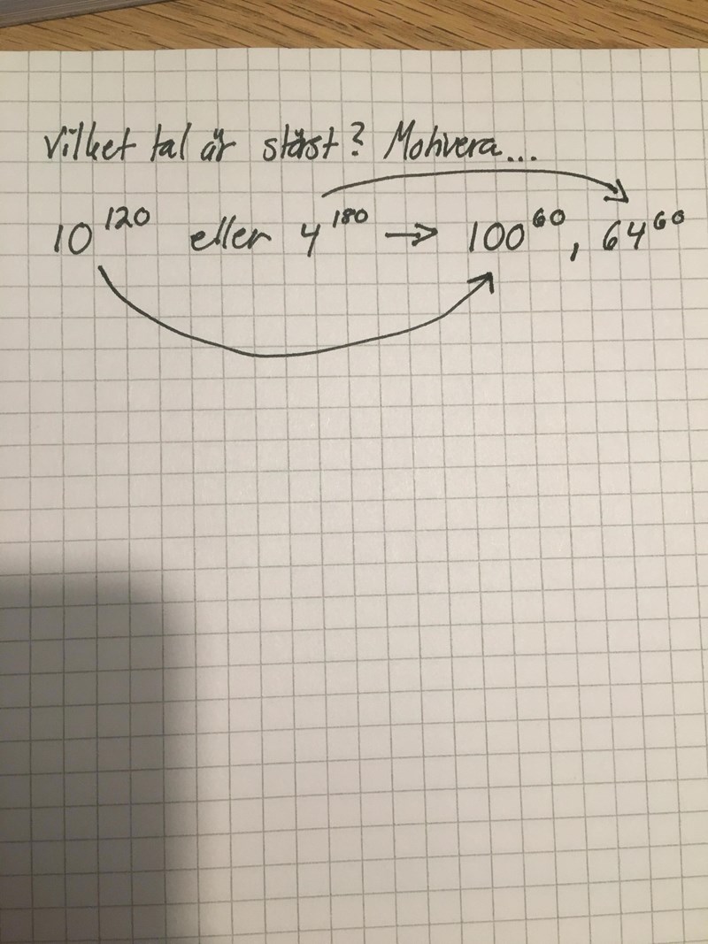 Tänker att 60 finns både 120 och 180 och att 3x60=180 och därför blir det3(4)^60 och det är 2x60 i 120 vilket blir 2(10)^60 och därav svaret. Har jag tänkt rätt då?
