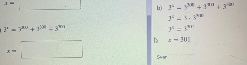 det står att 3^x=3^300+3^300+3^300 och att x är då 301. Men borde inte X isåfall vara 900?