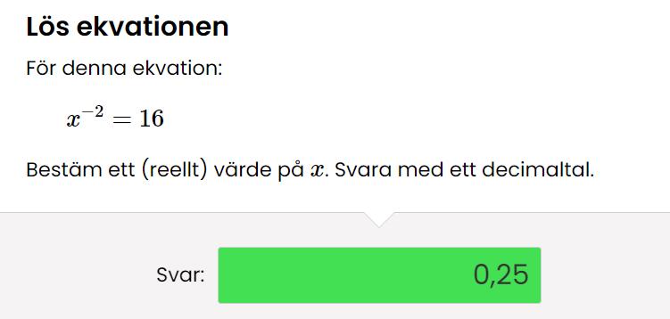 d v s x0 = 1 = 16x2. Om man fortsätter som du skrev och dividerar med 16 i båda led får man 1/16 = x2. På något sätt har du fått fram detta trots att du har skrivit konstigt på vägen. Nästa steg är att dra roten ur båda led, då får man att x = 1/4 eller x = -1/4.