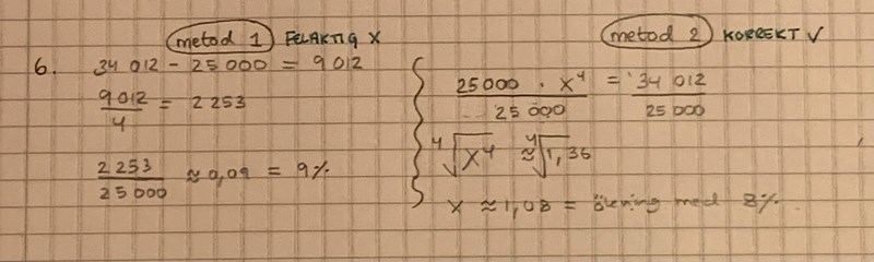 I metod 1 så tar du skillnaden mellan startvärdet och slutvärdet och delar det på 4 år (genomsnittsökning), det skulle betyda att pengarna växer linjärt för varje år, men det är inte riktigt fallet. Pengarna växer beroende på hur mycket pengar det finns just då. Första året så ökar startvärdet med en viss procentsats, men andra året så ökar det återigen med samma procentsats fast på det nya värdet, inte startvärdet. Metod 2 är korrekt då det tar hänsyn till det nya värdet varje år och ökar det (med 8% i det här fallet). Är inte 100% säker på detta men det är min tolkning i alla fall