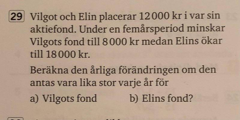 Här kommer ett exempel på en sådan uppgift. Här står det endast att man ska räkna den årliga förändringen. Eftersom att det även står att förändringen är lika stor varje år så tänkte jag att det var en linjär funktion. Men sedan när jag försökte lösa ekvationen så visar det sig att det inte är en linjär funktion utan en procentuell, och då behöver jag använda mig av C * ax istället.