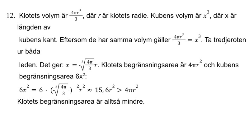 Jag fastnar vid För efter det fattar jag inte vad som händer. Efter står det att klotets begränsningsarea är och att kubens begränsningsarea är och (vilket jag fattar) men sedan är det beräkningarna under som gör mig osäker.