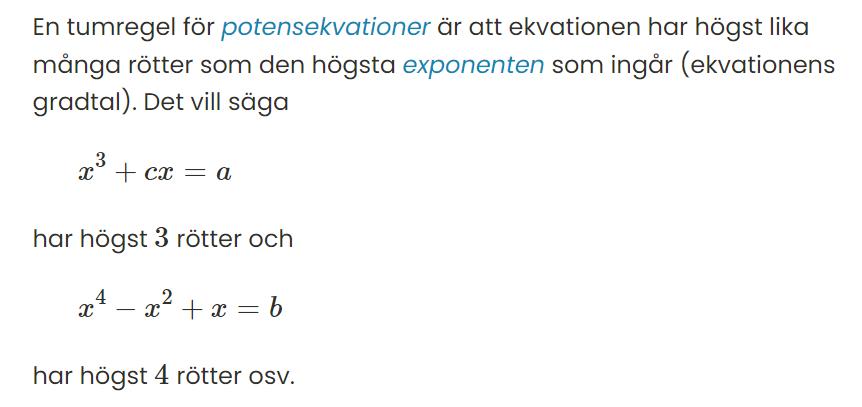Om man godkänner komplexa rötter också, så har alla n-tegradsekvationer exakt n rötter (om man räknar dubbelrötter som två, trippelrötter som tre o s v ).