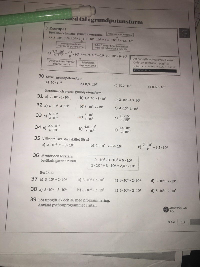Hej behöver hjälp med 30b) de är väl 5 x 10^2 men hur?? Förstår inte riktigt är de inte 5 x 10^4??