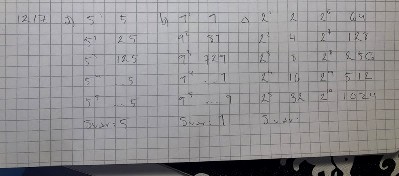 Med mönster menar jag att slutsiffrorna du har räknat ut börjar om efter var fjärde. Så om du hoppar 4 framåt eller bakåt är du tillbaka på samma. Tex 2^5 har samma slutsiffra som 2^1 eller 2^9.