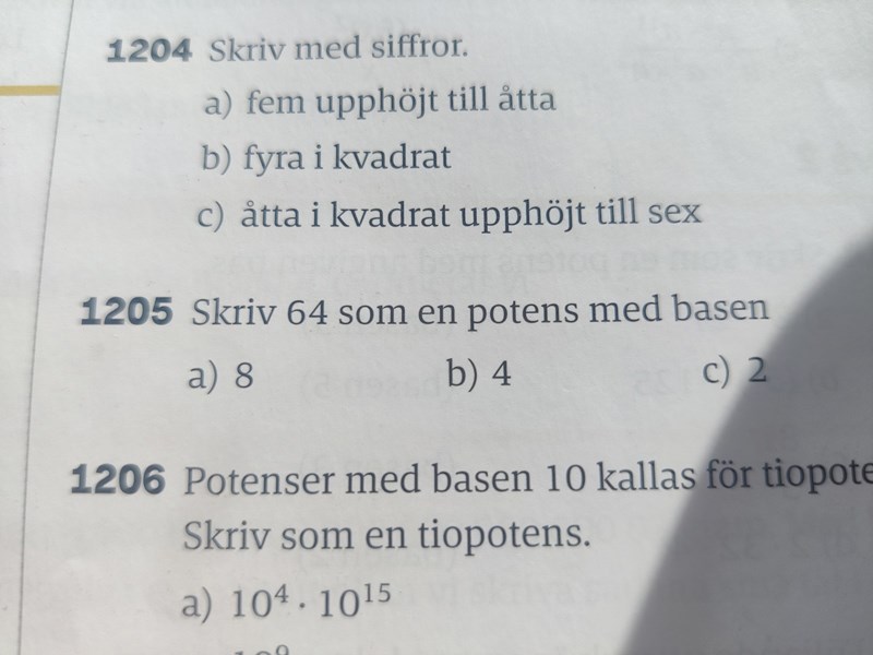 Hej! För att ekvationen ska stämma måste du skriva 4x=64. Vid större tal är den ekvationen för svår att lösa. En metod för att räkna ut exponenten är att dela talet (64 i det här fallet) med basen till du kommer ner till 1. Antalet gånger som du har delat blir exponenten.