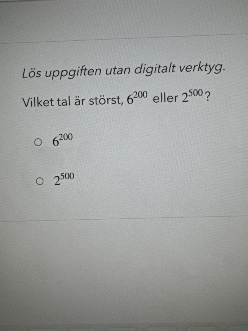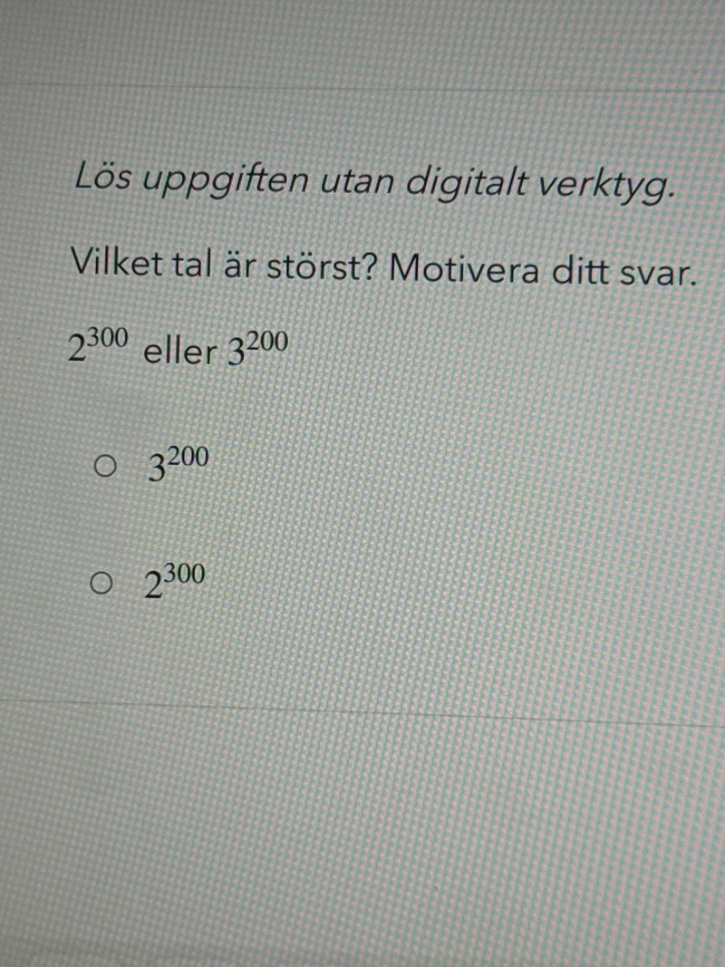 Innan man börjat med logaritmer, så är det klurigt att jämföra potenser. Det finns två trick man kan ta till, som åtminstone jag tycker är bra.