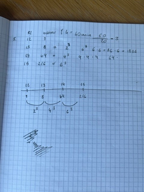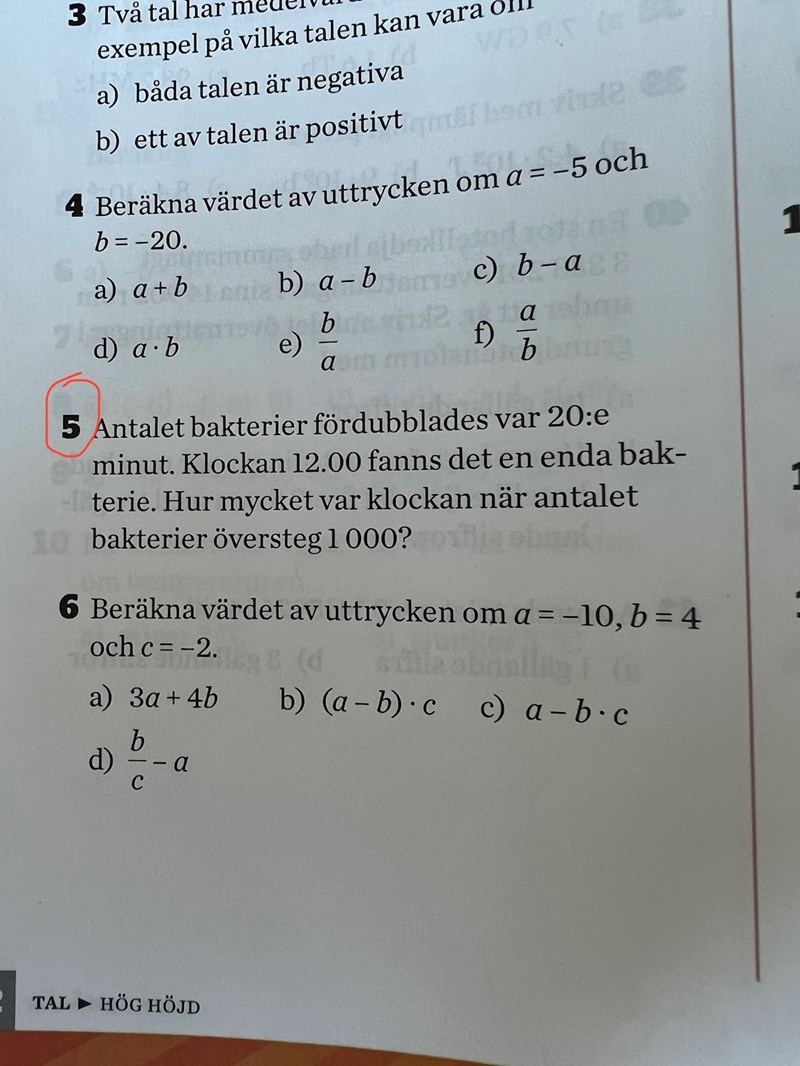 Jag vet att från klockan 12 till klockan 13 ökar antalet bakterier till 8, klockan 14 finns det 64 bakterier och klockan 15 är det 216 bakterier. Men jag vet inte hur jag ska fortsätta här ifrån. Kan ni hjälpa mig hur jag ska tänka här?