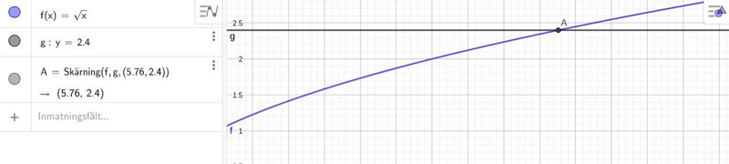 För att få fram ett exakt svar (mer exakt än om du bara tittar med ögat och försöker avgöra x-värdet) kan du ta en ny rad i ditt grafritande program och skriva in funktionen f(x) = 2,4 och sedan klicka på skärningspunkten mellan de två graferna.