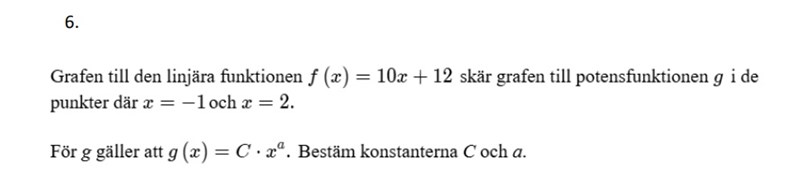 Hej! behöver hjälp med denna uppgift. I denna uppgift så är det inte tillåtet att använda miniräknare eller geogebra(vi jobbar med den). Jag har listat ut koordinatvärderna med hjälp an den linjära funktionen. Och fick fram att när x är -1 så är y= 2. Och när x är 2 så är y= 32.