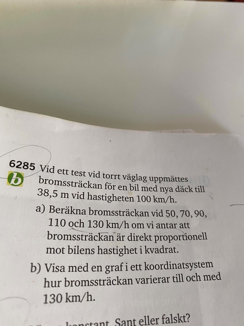 Formeln du ska använda är korrekt, men din gissning fungerar inte riktigt. Kalla bromssträckan för y, och någon slags konstant för c. Denna konstant kan bero på exempelvis underlag, väderlek, däckens friktion, mm. Hastigheten är x. Det ger dig ekvationen . Om vi sätter in testet vi fått i uppgiften, får vi ekvationen . Vad är c?