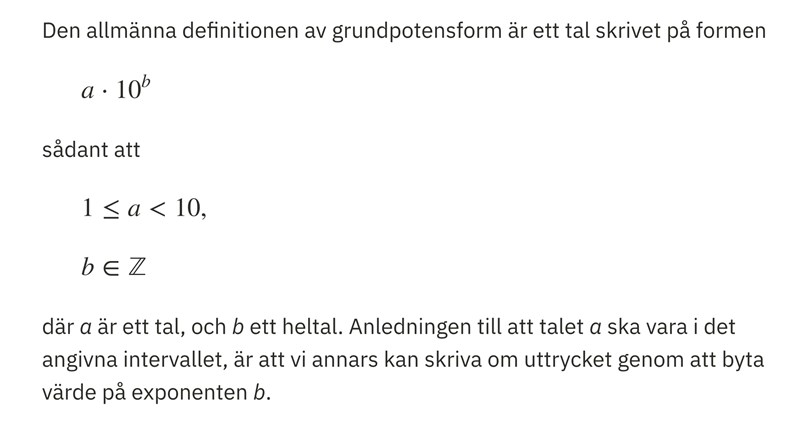 "Ett tal skrivet i grundpotensform kan delas upp i två delar, först siffervärdet, därefter tiopotensen. För att talet ska vara skrivet i grundpotensform krävs att siffervärdet är ett tal som är större än eller lika med 1 och mindre än 10."