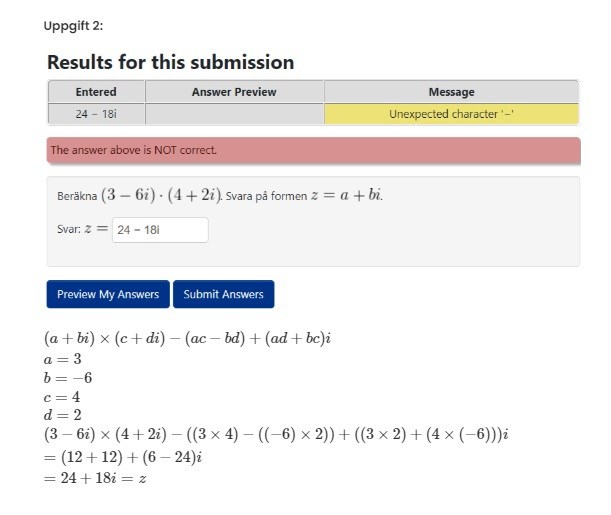 Resultatet av multiplikationen blir 24-18i.