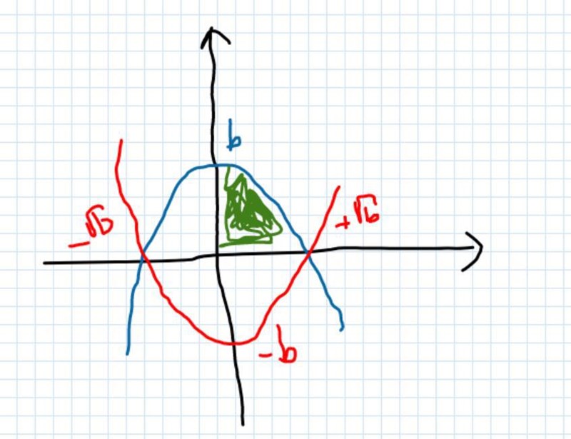2·0b{(b-x2)-(x2-b)}dx \displaystyle 2 \cdot \int_0^{\sqrt{b}} \{(b-x^2)-(x^2-b)\}\text{d}x ,