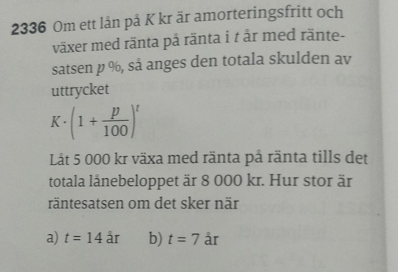 Låt K = 5000 kr växa med ränta på ränta tills det totala lånebeloppet är 8000 kr. Hur stor är räntesatsen om det sker när a) t = 14 år b) t = 7 år.