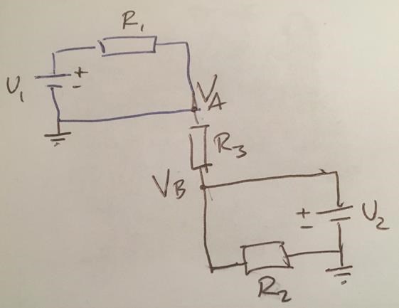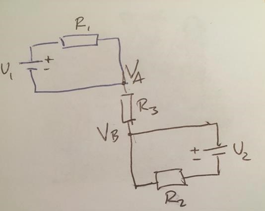 Jag har ritat krets1 bestående av batteriet U1 och resistorn R1, och krets2 bestående av batteriet U2 och resistorn R2. Kopplar du ihop dem med en resistor R3 som jag har ritat, så kommer ingen ström att flyta genom R3, trots att potentialen VB är batteriet U2's pluspol och potentialen VA är U1's minuspol (du har ju just lär dig att strömmen flyter från plus till minus, så hur kommer det sig att ingen ström flyter här?). Jo, de två potentialerna VA och VB är angivna i två helt olika referenssystem, U1's referenssytem  respektive U2's referenssystem, så det finns helt enkelt ingen potentialskillnad över R3. Det som kommer att hända är att potentialerna VA och VB kommer att anpassa sig till varandra så att de blir lika, vilket får konsekvensen att ingen ström kommer att flyta genom R3. Däremot flyter lika stor ström genom R1 och R2 som om R3 inte hade funnits.