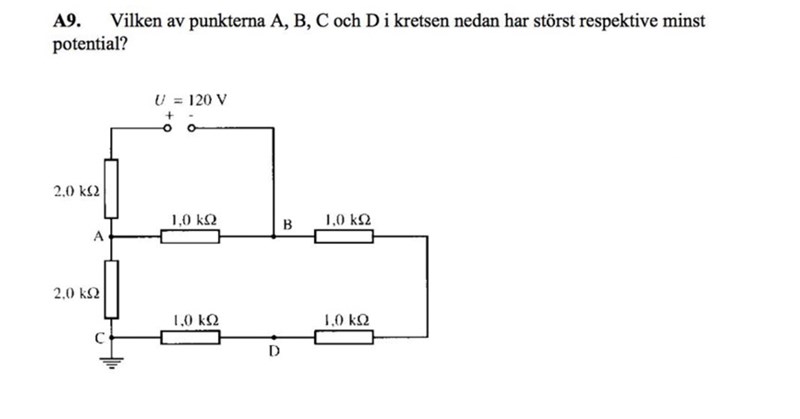 Börja med den enklaste frågan: vilken punkt  i kretsen har lägst potential?