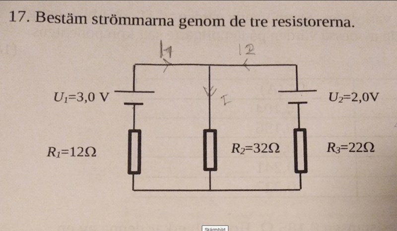 För att lösa uppgiften måste man göra potential vandring och bilda ett ekvationsystem, jag försökte markera hur strömmen går genom kretsen och sen vet jag att I=I1+I2, kan jag få hjälp med att ställa upp ekvationsystemet har försökt men jag lyckades it.