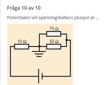 Hej, hur ska jag tänka på den här uppgiften. De frågar efter potentialen vid spänningskällans pluspol som jag antar betyder potentialen före den blir jordad? Hur som helst kommer jag inte mycket längre.