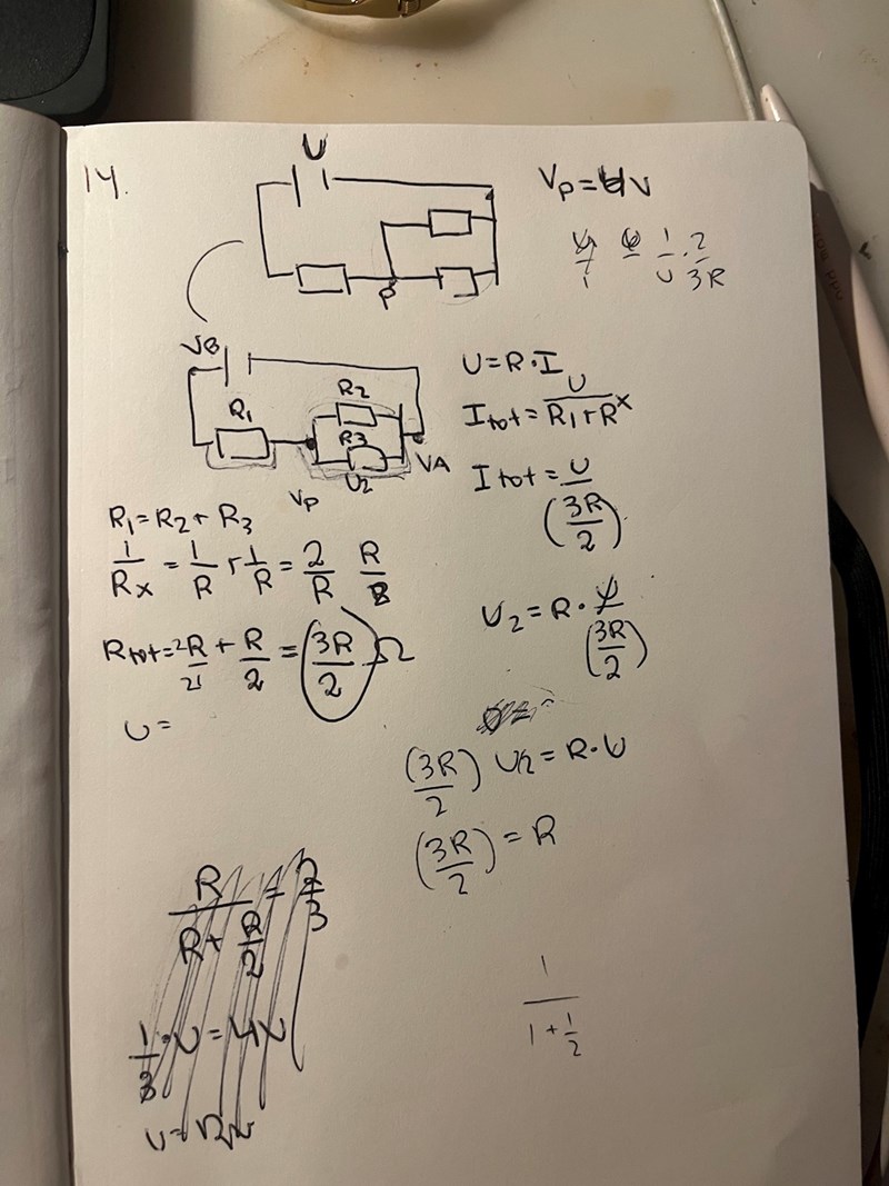 Strömmen i kretsen är därför U/(3R/2) = 2U/(3R)