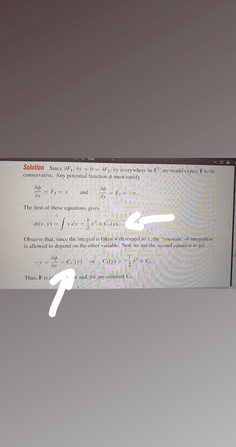 Som det står vid din övre pil, så skall C1 vara en konstant med avseende på x, den kan mycket väl (men behöver inte) bero på y. Exempelvis är hela uttrycket 3y2-5 en konstant, om man deriverar m a p x.