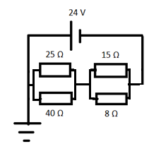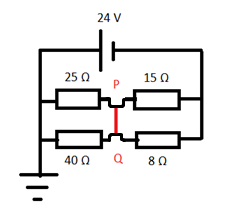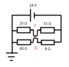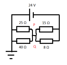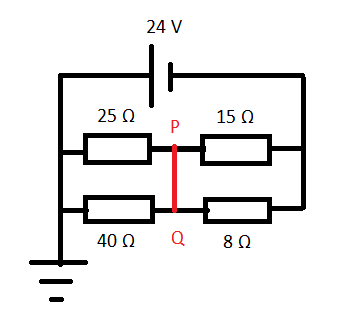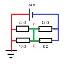 Jag försökte, men problemet är att vid Q så kan strömmen komma in från 2 punkter, antingen från P, eller från 40 Ω. Strömmen kan alltså gå åt 3 håll: 25-15, 25-8 eller 40-8. Dessutom, så är strömmen olika stor vid de 2 motstånden, så det går inte att räkna ut den med formler.