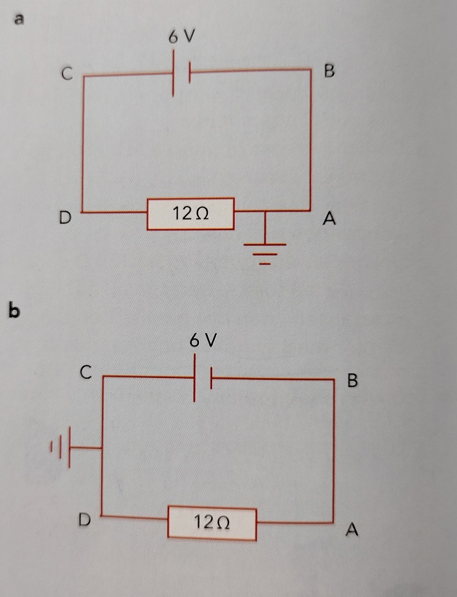 Jag kan också göra en potentialvandring. I a så är A och B 0 och i b är C och D 0 eftersom att de är i direkt kontakt med jordade punkten. Men hur gör man sen? Jag läste nåt om att potentialen ökar i riktning från den negativa poolen till den positiva och att det är tvärtom i en resistor. Men hur vet jag vilken väg jag ska välja här?