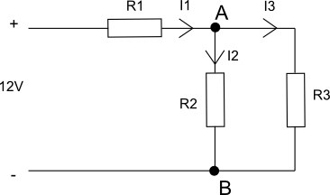 Här har vi R1 i serie med två parallellkopplade resistanser. Då kommer strömmen att dela upp sig i punkten A (och gå ihop i punkten B). De parallellkopplade motstånden har samma spänning över sig, vi kallar den U, så genom att använda ohms lag igen kan vi skriva: