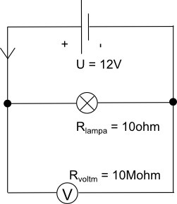 Här har jag satt att voltmetern har en resistans på 10Mohm. Genom lampan går strömmen 12/10 = 1.2A och genom voltmetern går det 12/107 = 1.2x10-6 A. Två saker kan vara värt att tänka på: