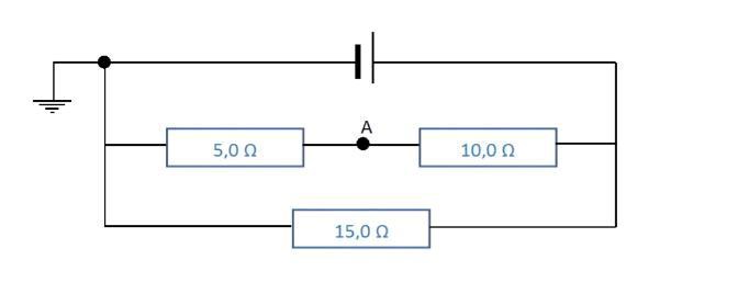 Ett batteri med en ems på 0,9 V och inre resistansen 2,0 ohm kopplas in i en krets enligt bilden nedan. Batteriets negativa pol jordas. Bestäm potentialen i punkten A.