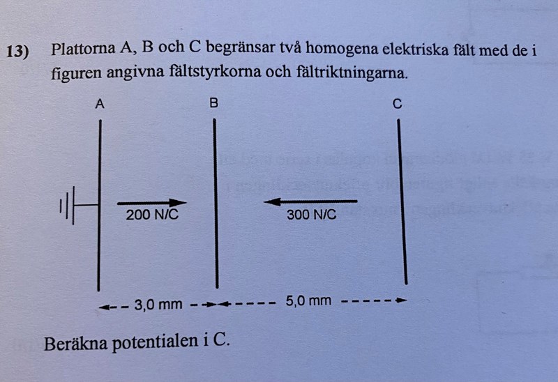 Mellan A och B har vi alltså 200 V/m och ett avstånd på 3 mm. Kan du då räkna ut vad potentialen i B är?