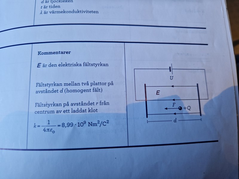 b) I punkten A är fältstyrkan 3,0 V/m. I A placeras en negativ laddning med storleken 42 µC. Markera i figuren riktningen av den kraft varmed laddningen påverkas av fältet samt beräkna kraftens storlek