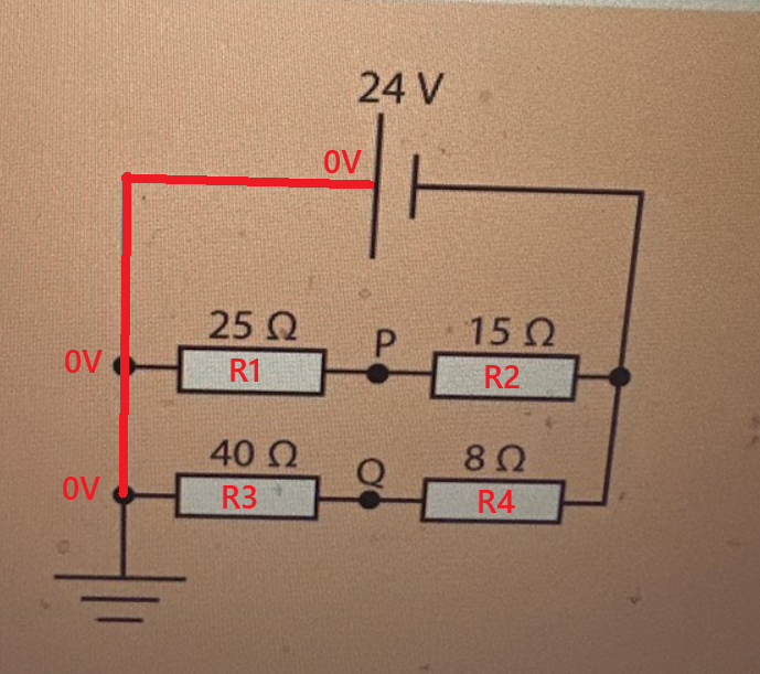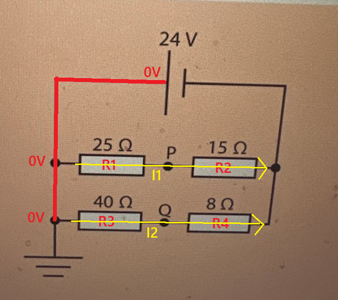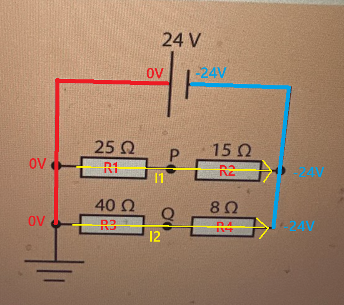 Jahaaaaa så hela det röda är jordad, jag förstår nu! Men jag undrar varför är inte spänningen över 40 Ohm och 25 Ohm oclså noll? När de också är kopplade till jod