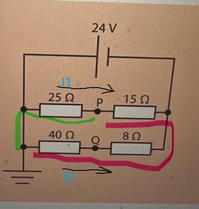 Enklare är väl att konstatera att det ligger samma spänning (24 V) över de två parallella grenarna, och räkna ut strömmen resp gren till 24/(25+15), resp 24/(40+8) för att därefter få fram spänningsfallet över resp motstånd. Som jag gjorde i#4