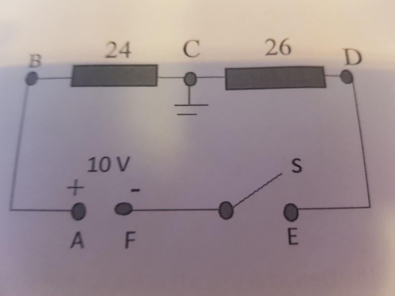 a) Om S är öppen så går ingen ström igenom kretsen. Vad blir då potentialen VA, VD och VF ?