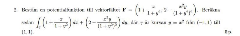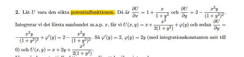 AlvinB skrev:Om man använder potentialfunktionen för att beräkna en kurvintegral sätter man konstanten till noll för enkelhetens skull (eftersom integrationskonstanterna tar ut varandra i subtraktionen), men nu har vi ju ett villkor som potentialfunktionen skall uppfylla. Då måste vi räkna fram ett värde på konstanten.