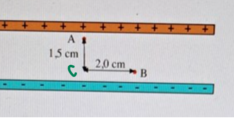 Jag förstår inte riktigt. Vi söker potentialskillnad mellan A och B. I bilden är fältet på väg mot den negativa plattan i y-led och inte i sidled som i fallet med punkten B.