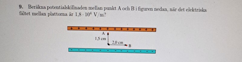 så med 1,8*104 V/m och ett avstånd (i fältets riktning ) PÅ 0,015 m har vi potentialskillnaden