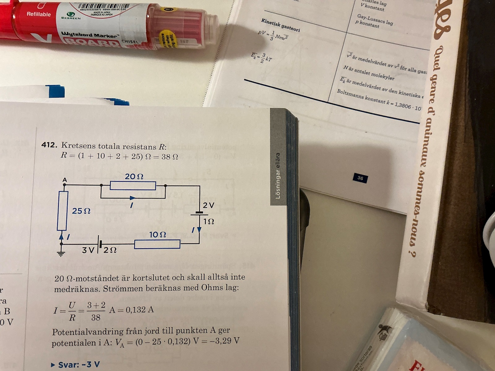 Hej, varför får jag olika svar när jag potentialvandrar från olika håll? Éfacit har valt att gå direkt över 25 ohms motståndet. Jag ville pröva det andra hållet.