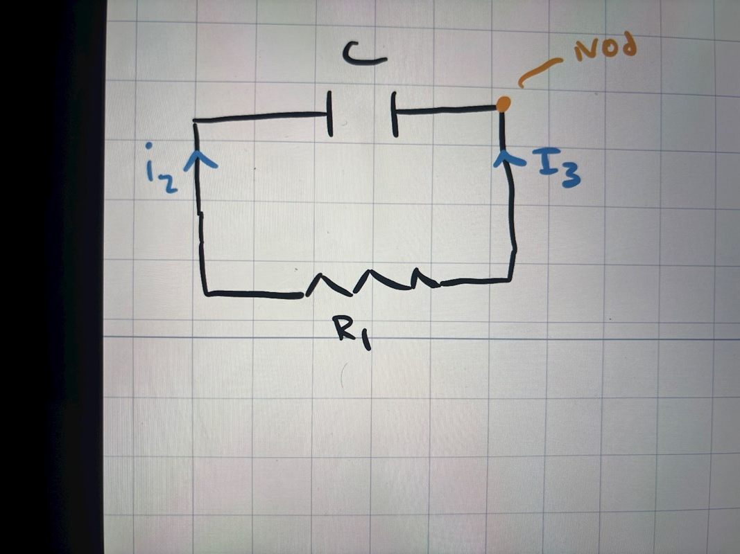 Såhär tänkte jag och följde kirchoffs strömlag, alltså att strömmarna in mot en nod tas som + och båda går in mot noden så i2 + i3 = 0