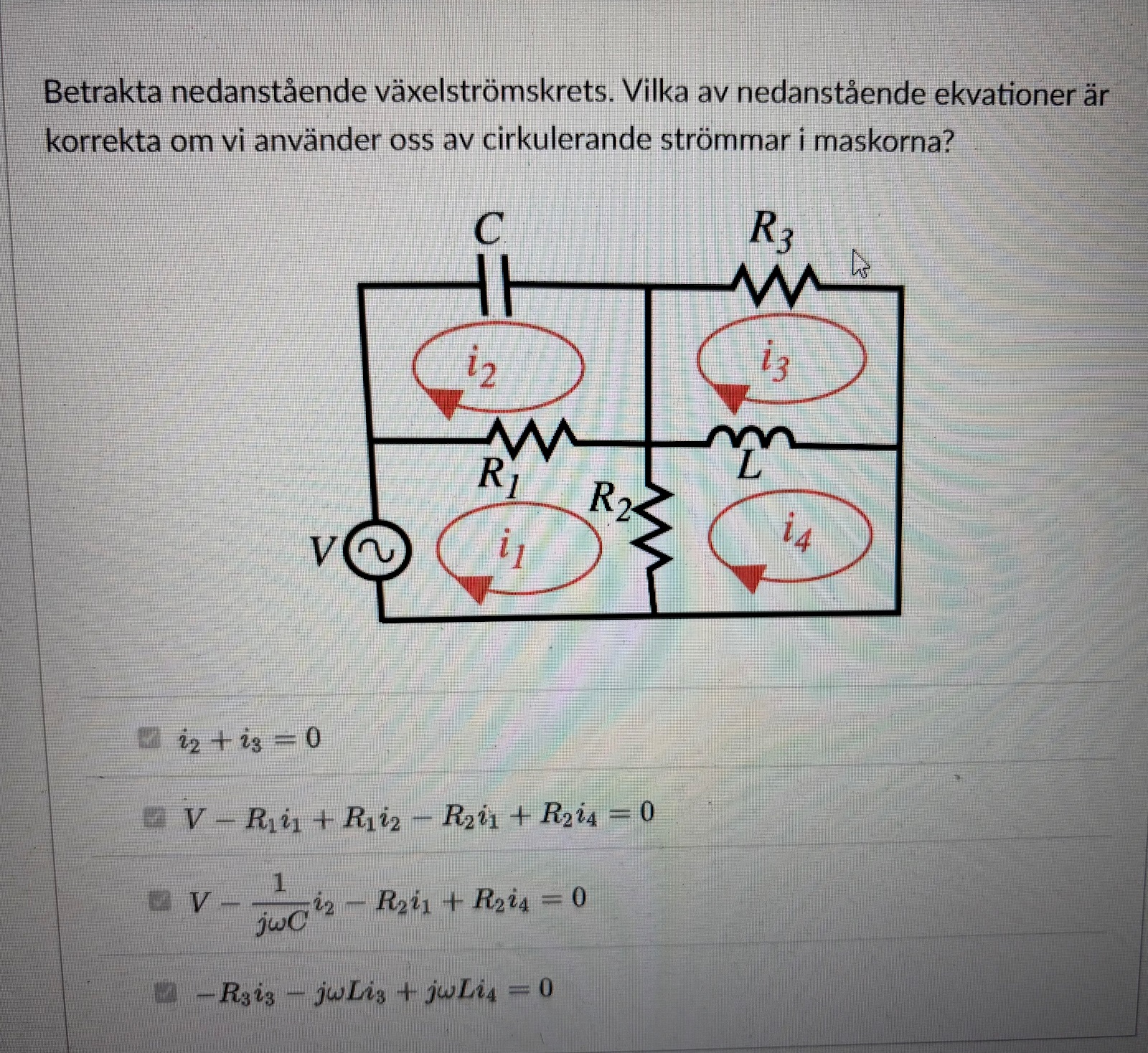 Jag har suttit ganska länge med denna uppgift och jag kommer inte fram till vilken som är fel. Jag delade upp varje alternativ i delkretsar och potentialvandrar samt använder kirchoffs lagar. Ändå får jag fel. Jag vet att går vi motström så blir potentialändringen positiv och medström så blir den negativ. Samt även att strömmar in mot en nod adderas till noll t ex i2+i3 = 0 då de går in mot en gemensam nod. Jag får fel men vet inte varför. Snälla hjälp!