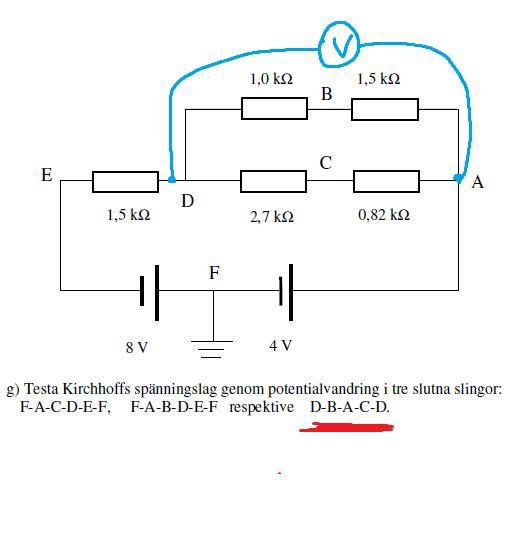 Hej, ska lösa följande uppgift som står i bilden (Testa Kirchhoffs spänningslag genom D-B-A-C-D).